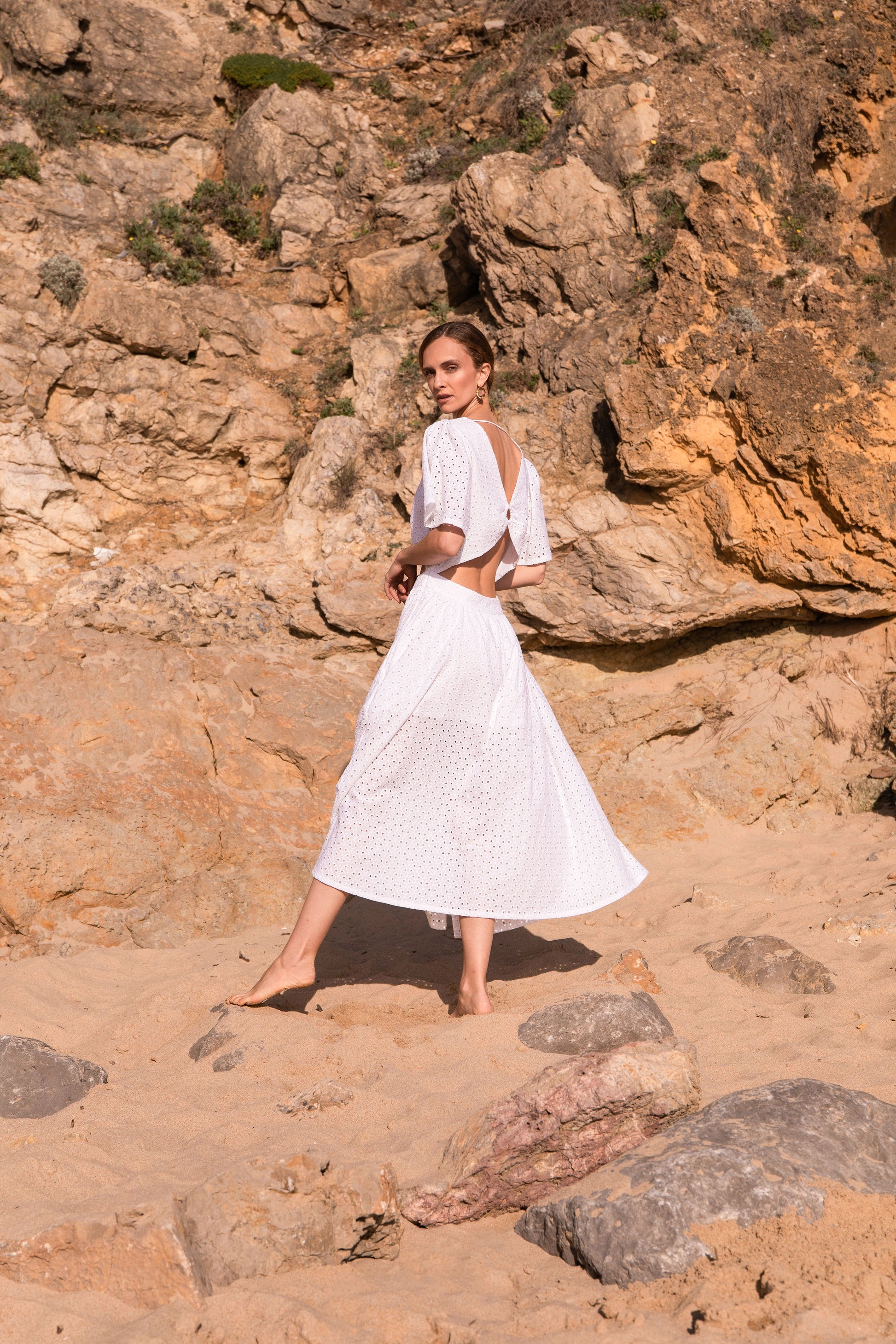 This dress scream SUMMER. We have achieved a perfect fitting in this sensual cut out dress. Crafted in 100% cotton broderie anglaise, the perfect cut out allow for you to wear bra, open at the back and with the perfect skirt lengh. A summer holiday essential.
