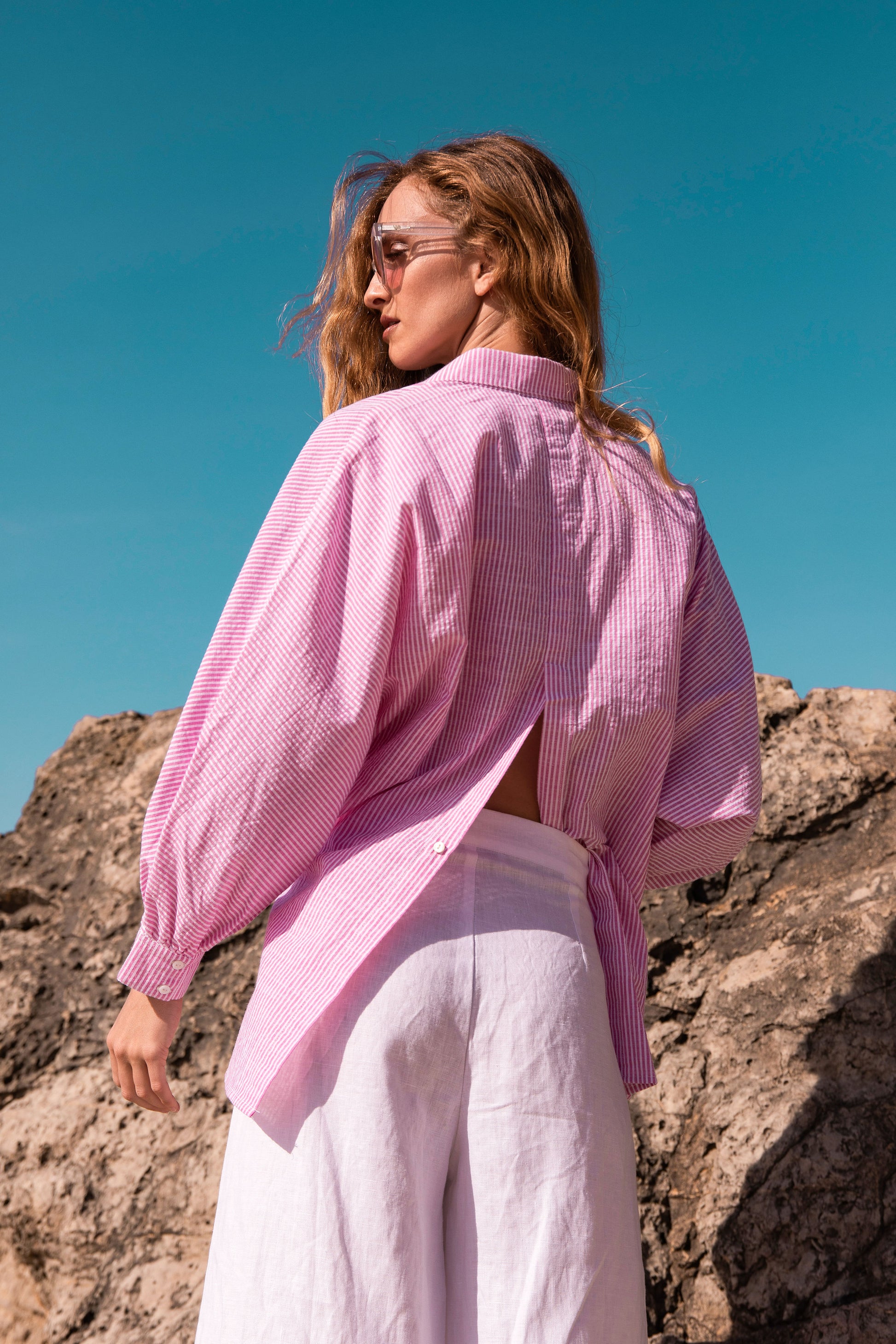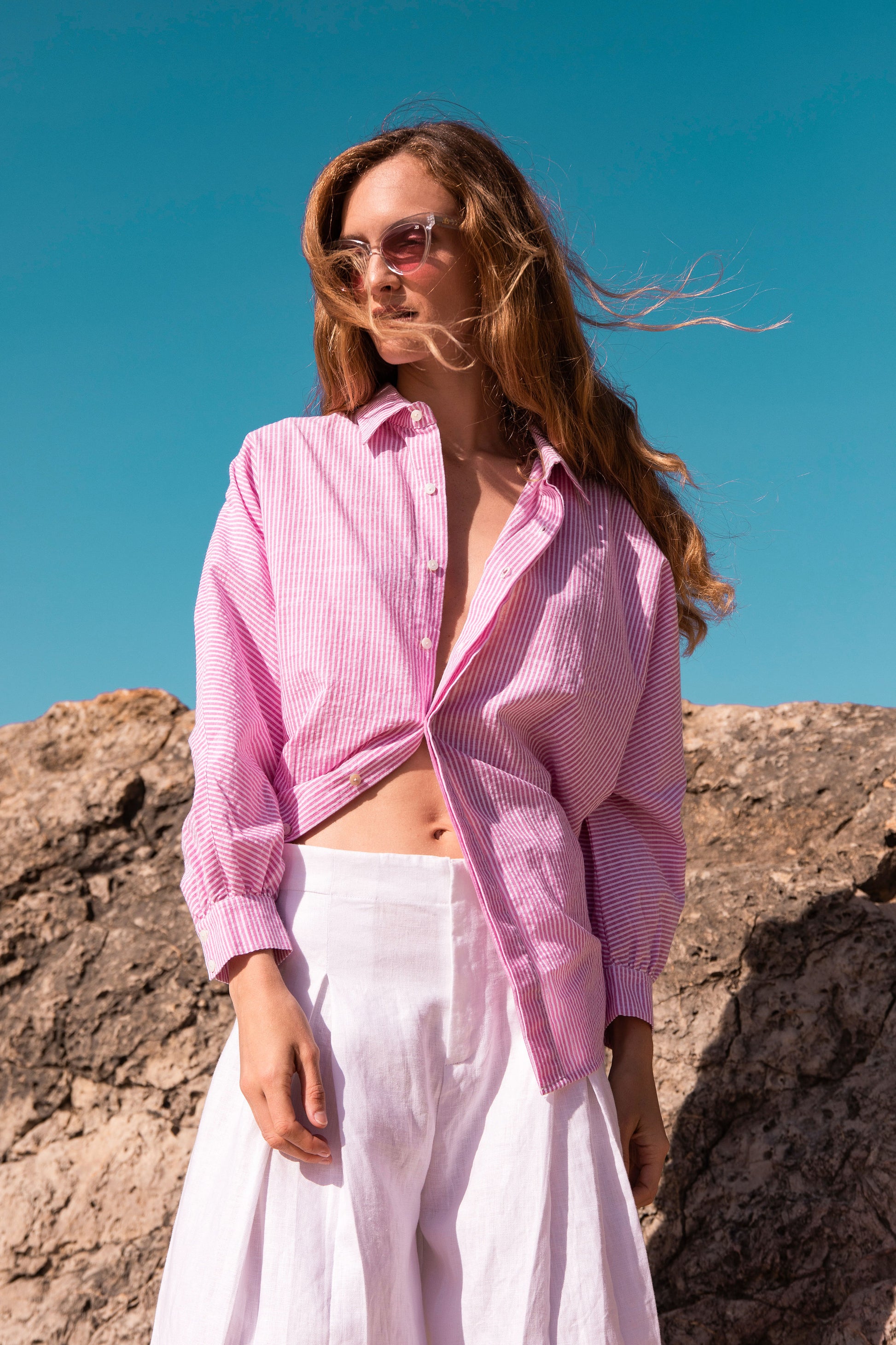 Las Cholas Studio best seller. 80's cut, oversize, with an open back that can be close with a button. Our Annalisse shirt is the perfect piece for the city, a perfect transitional item to add to yoir wardrobe and the best cool cover up for the beach. Check with us color card for cotton stripes and cotton stripes seersucker