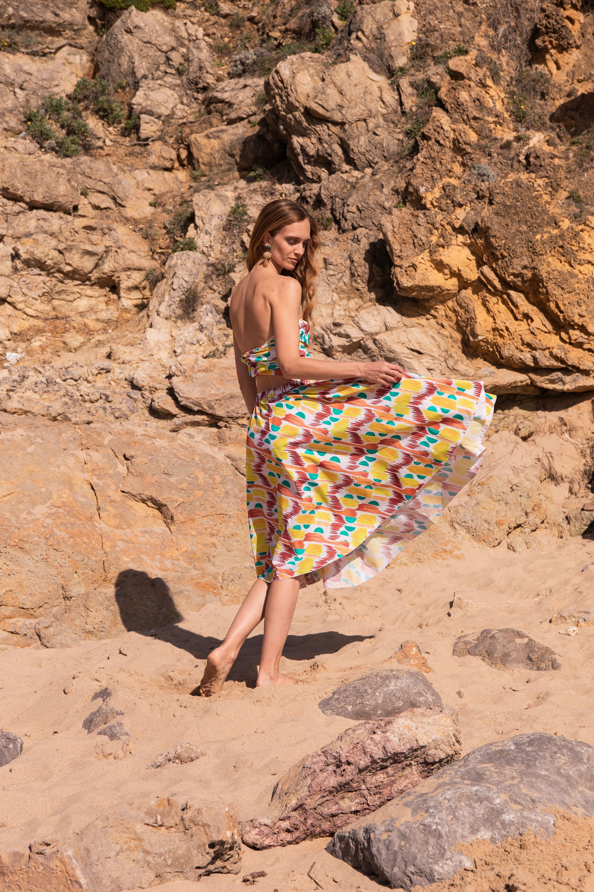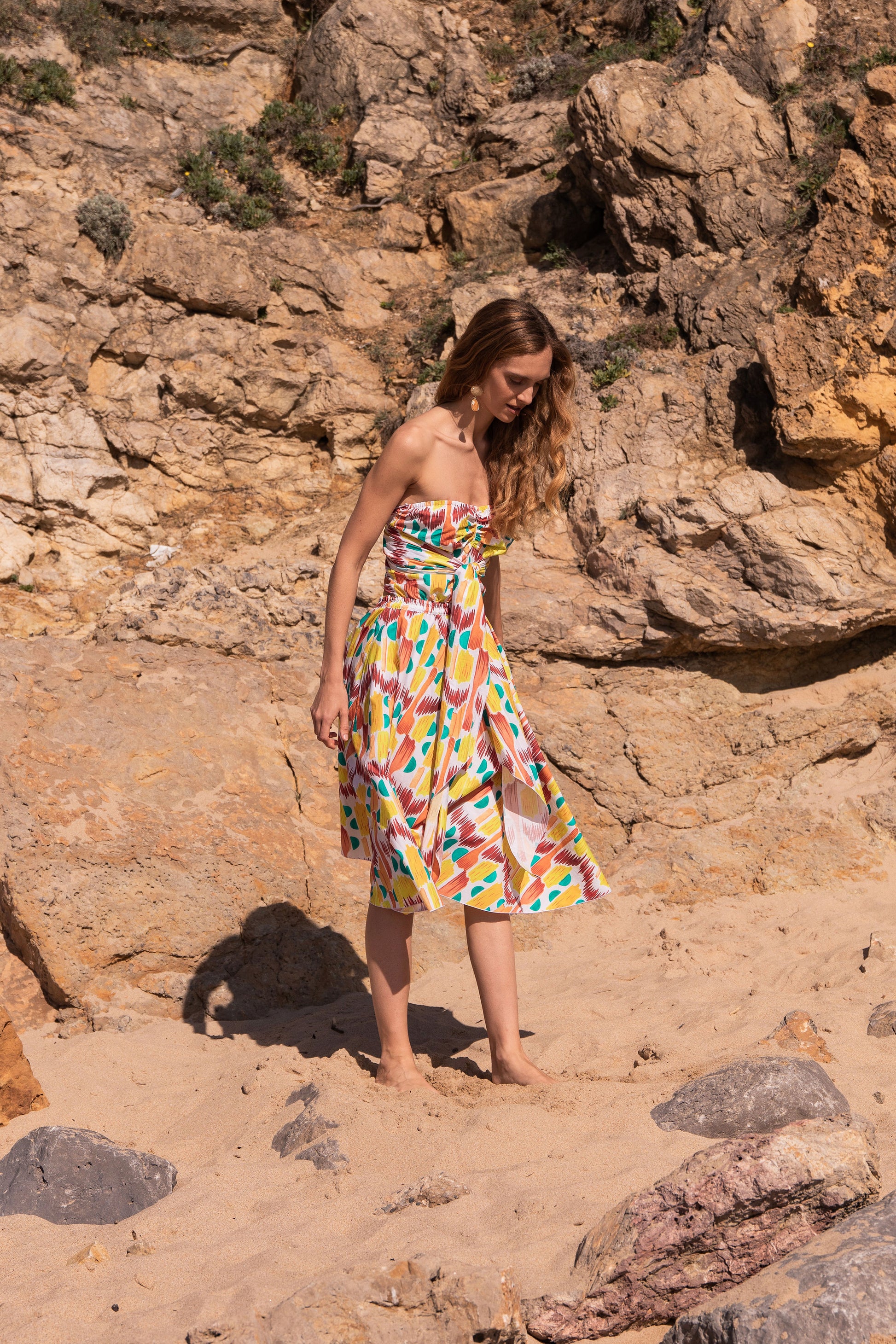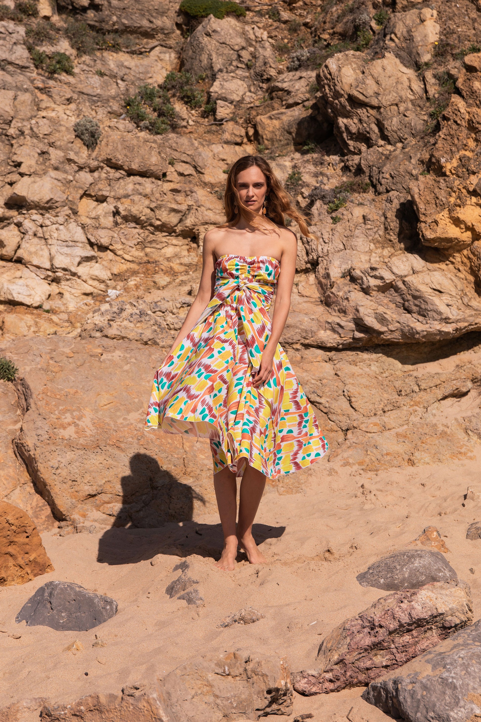 A perfect holiday dress. Full circle skirt with a bustier top that can be arranged in a haterneck style, or cinch at the waist at the front or back. Crafted in 100% cotton poplin in our exclusive hand drawing print "Morning Sun"