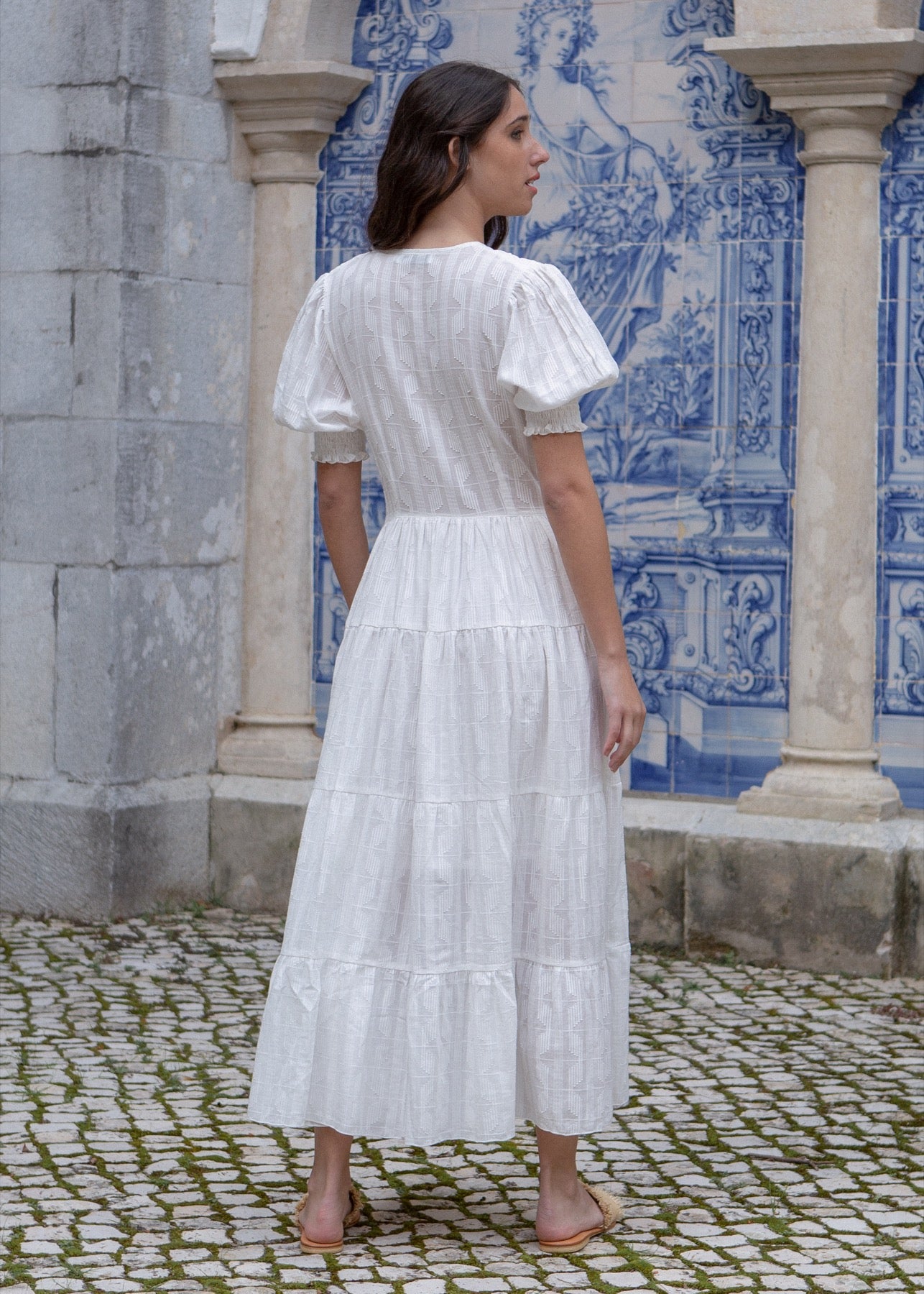 This piece scream “Lunch with friends”, “Holidays” “ Summer” , everything that you have been dreaming in one dress! Crafted in beautiful 100 % cotton wth a motif on the fabric, pintucks and trim details in the front, this hand made dreamy piece will be your perfect companion for the Summer