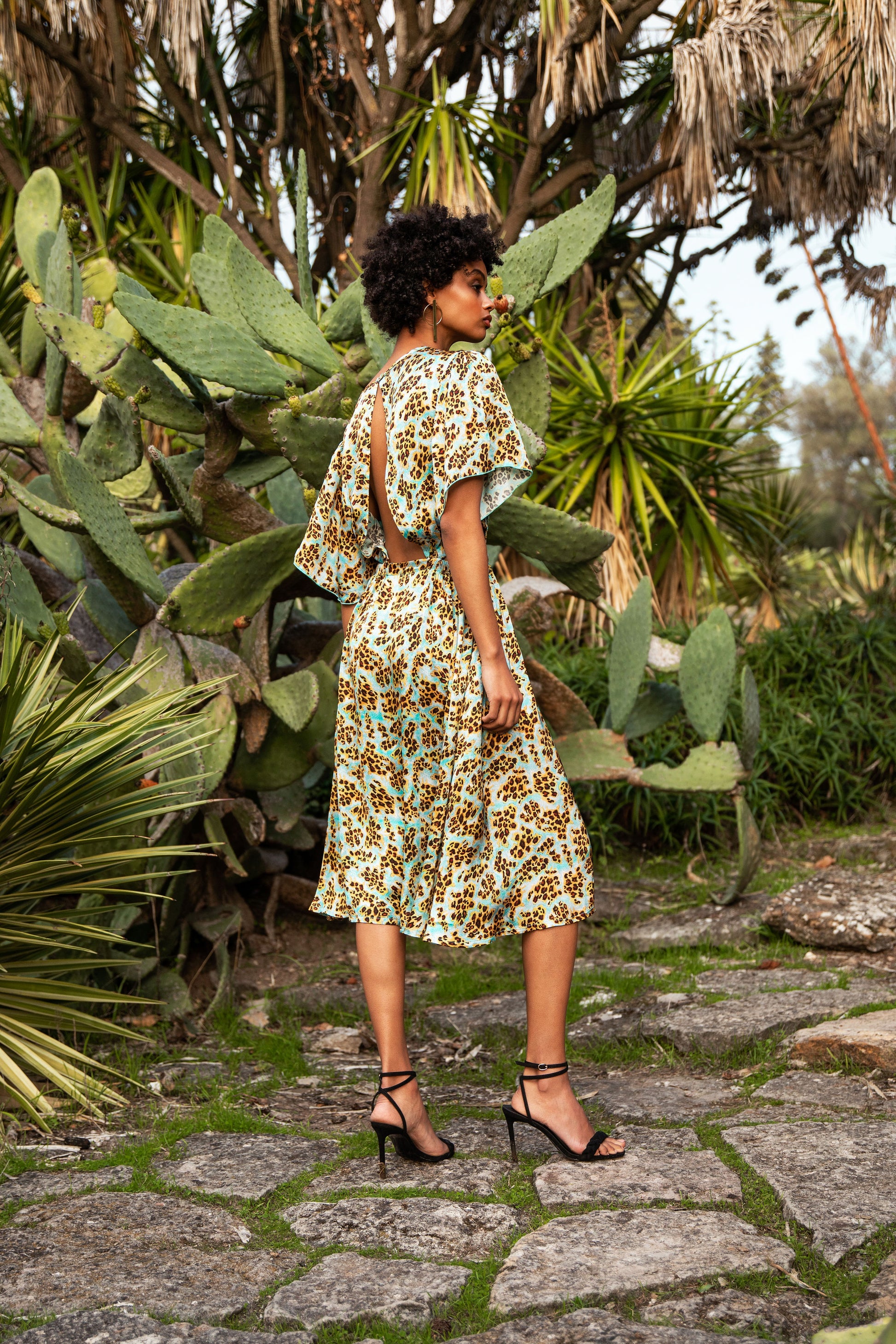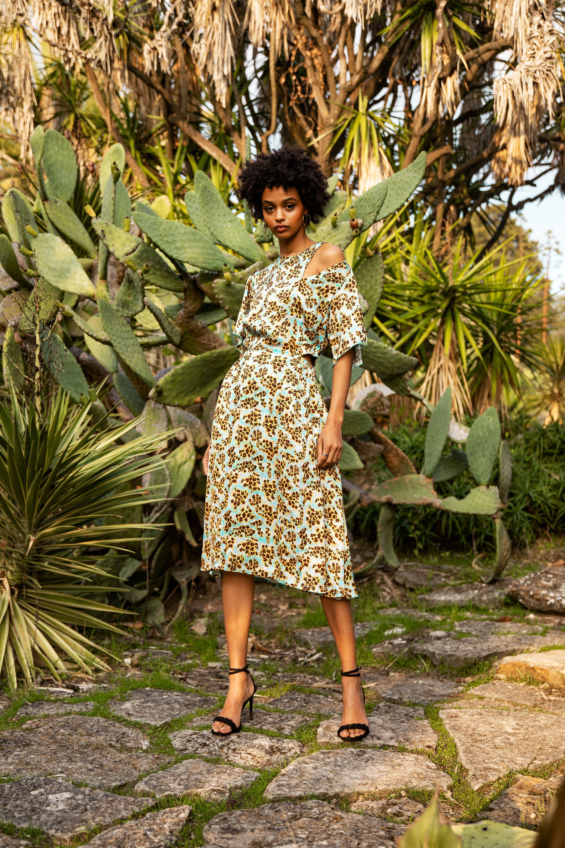 If one dress is screen party is our Etienne dress. Cut out at the waist line, front 80s cut out in the shoulder and super sexy back. The color and our exclusive print works well in darker and pale skin.