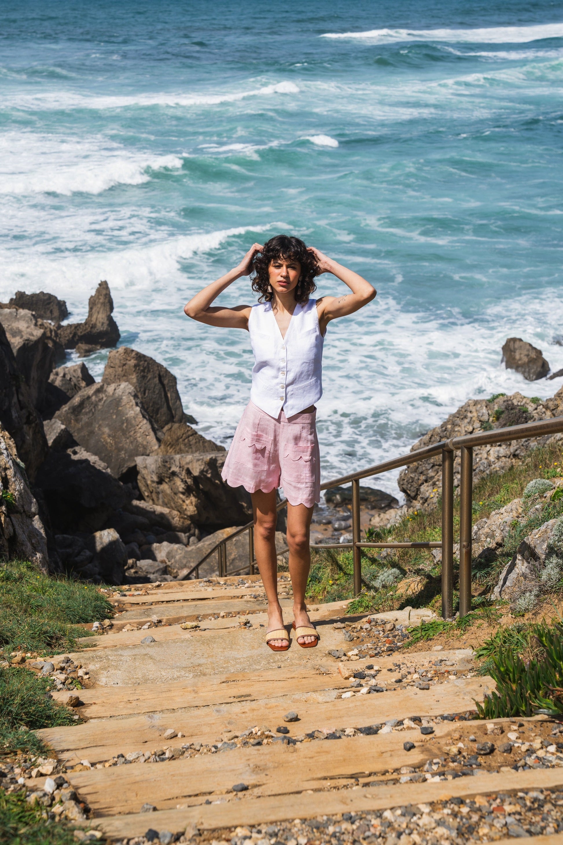 This vest has been crafted in 100% linen with 100% cotton lining. A mannish look that accentuante the waist, shoulders and bust. We love how it looks with our Alfama skirt or Lily shorts.