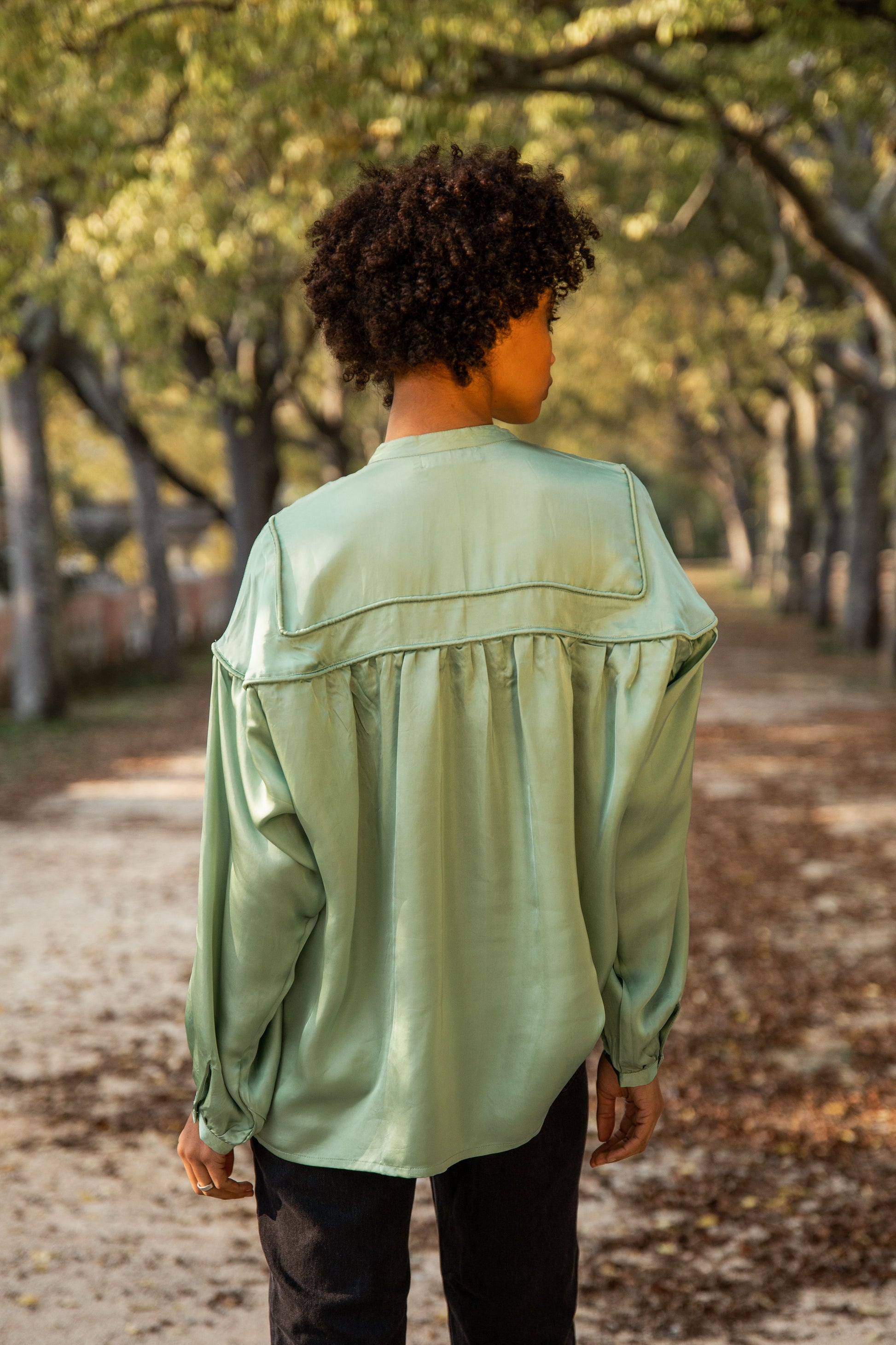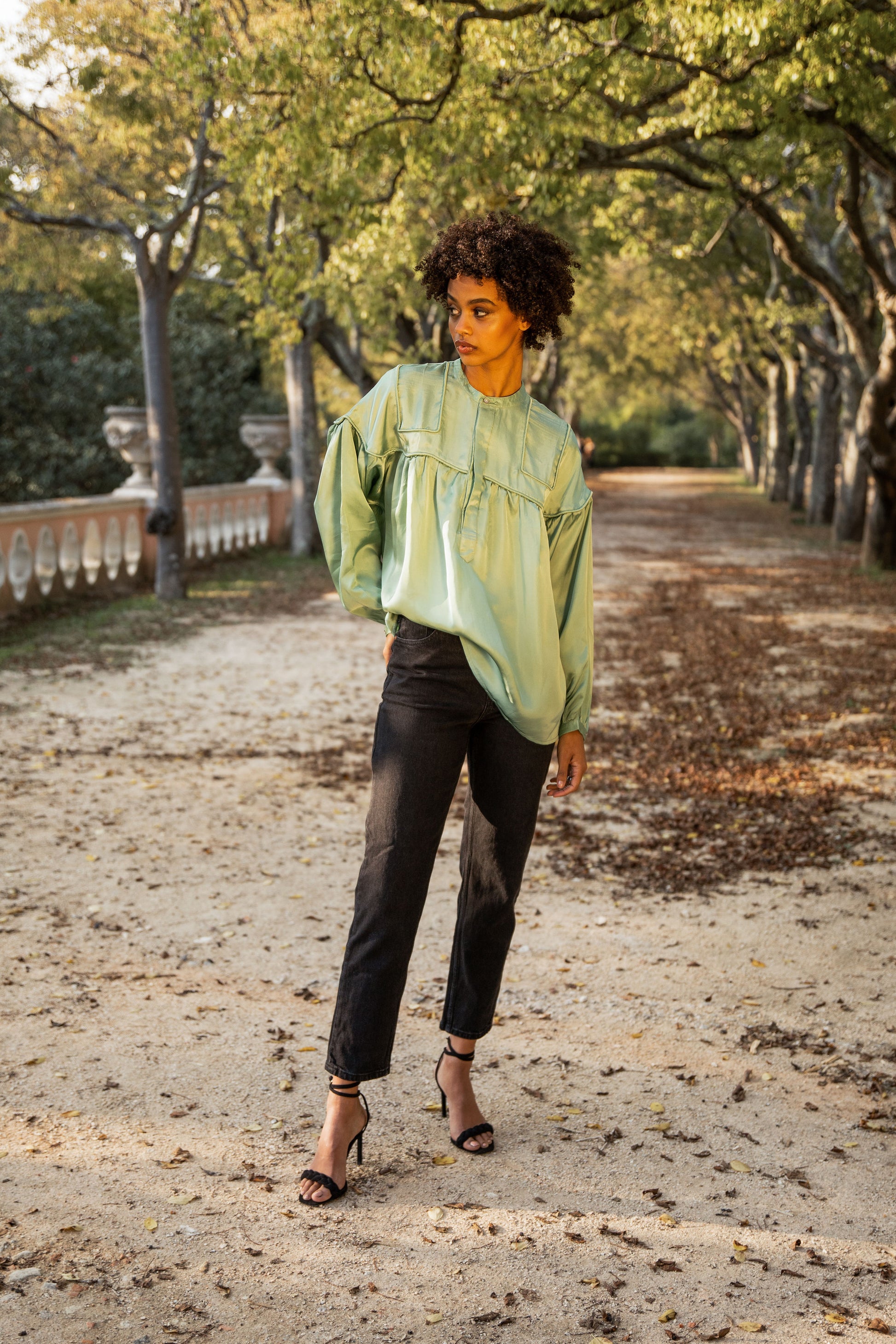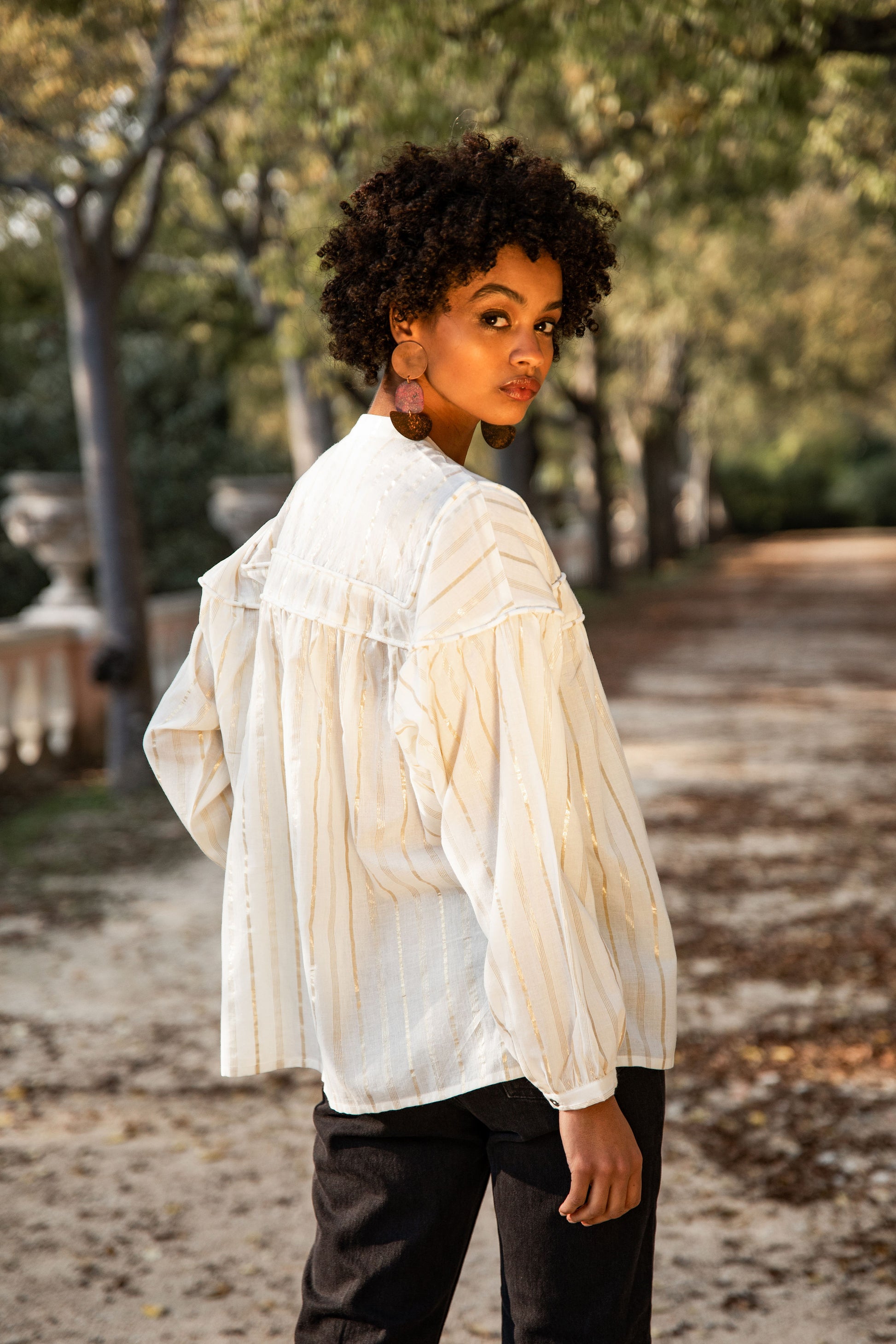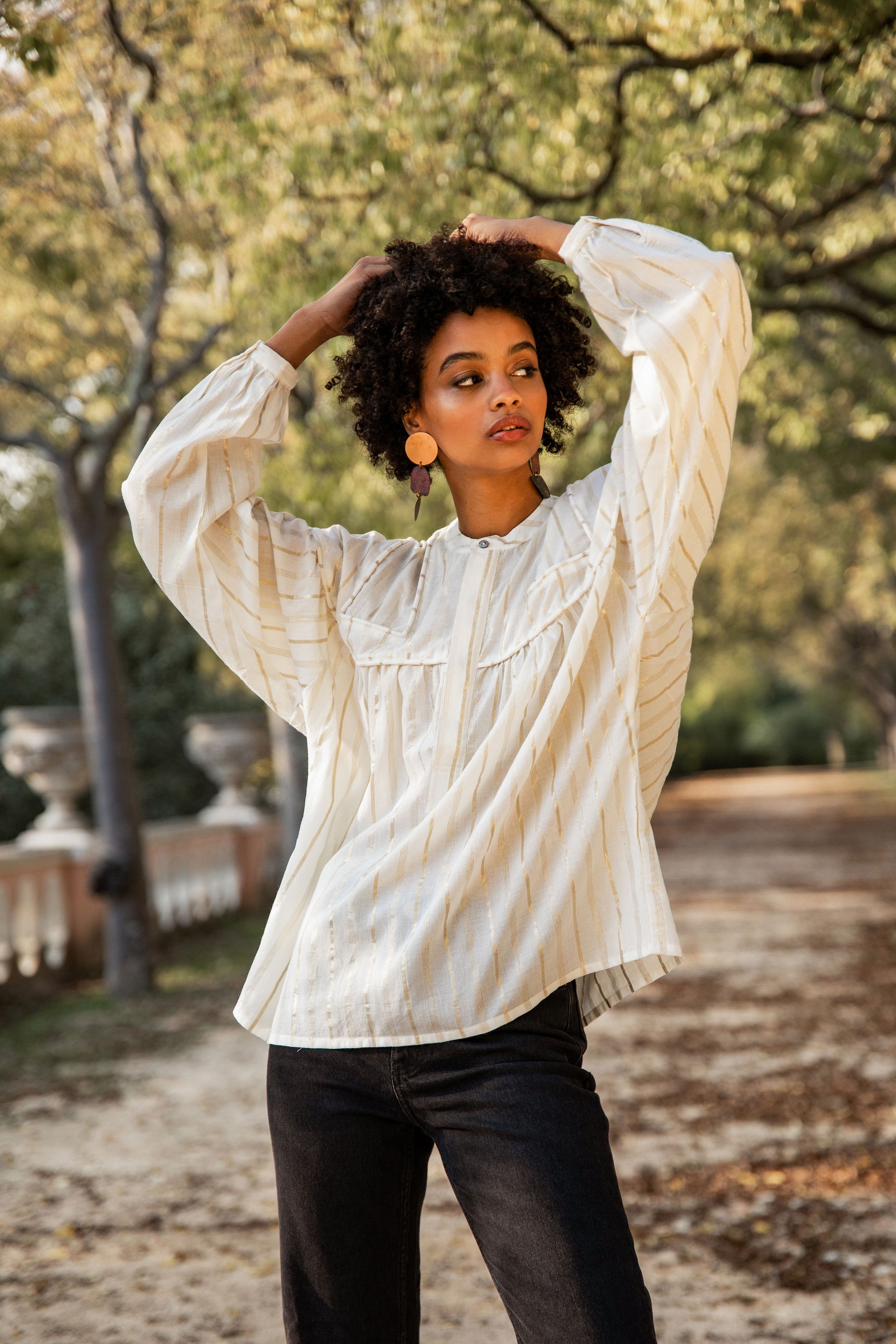 A superb blouse with and oversized silhouette and thin straps details around front and back of the shirt. Wear it tucked in with loose pants or let is loose with skinny jeans. Made of 100% cotton with gold stripes