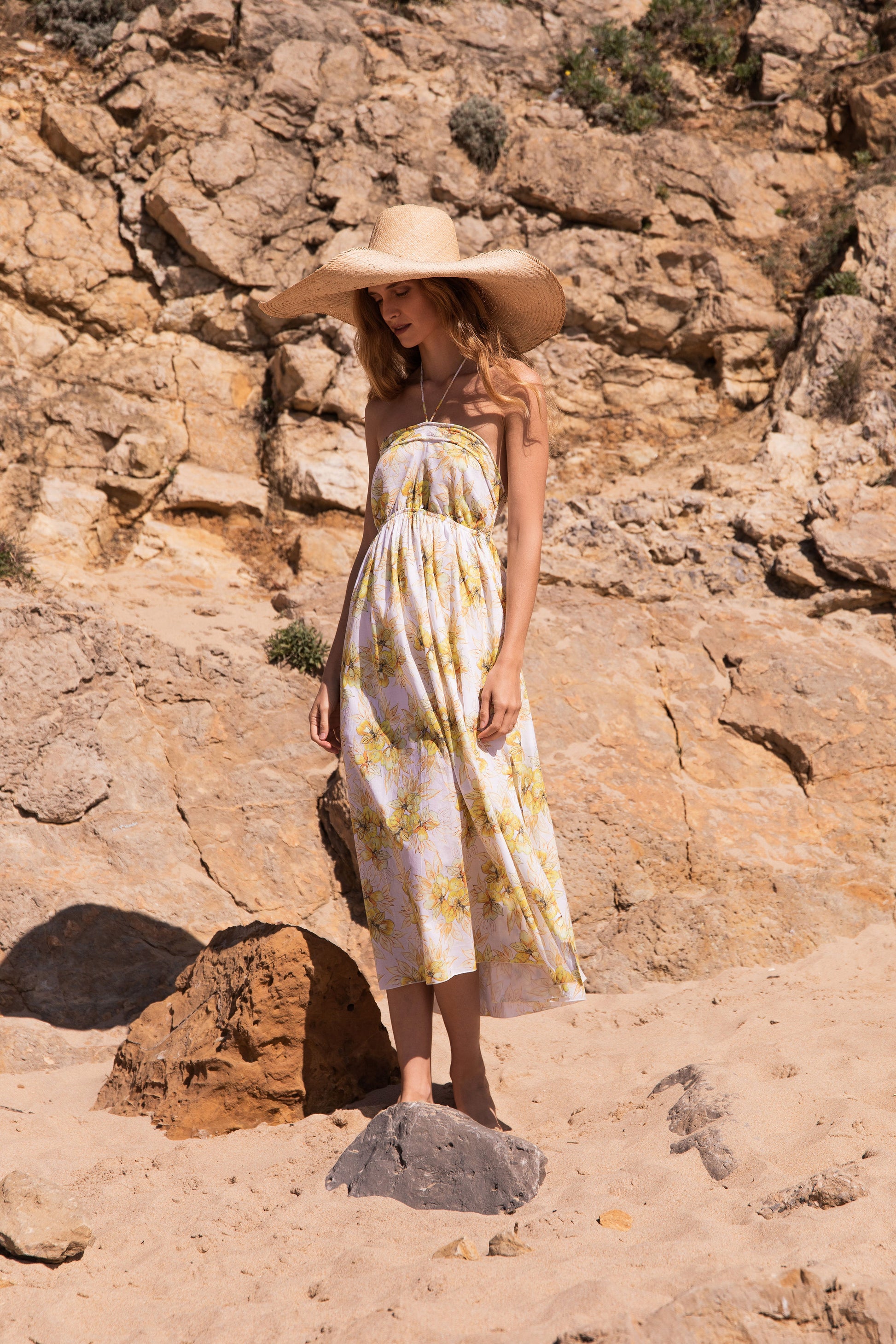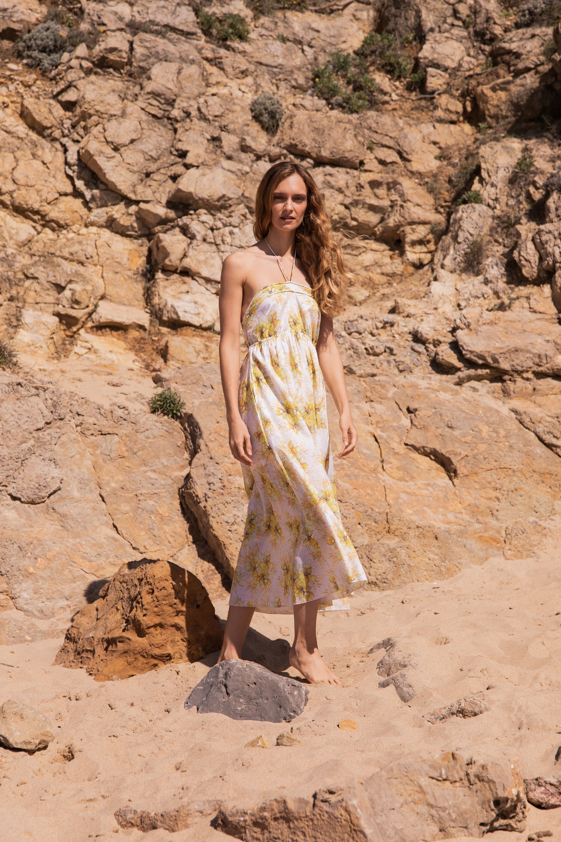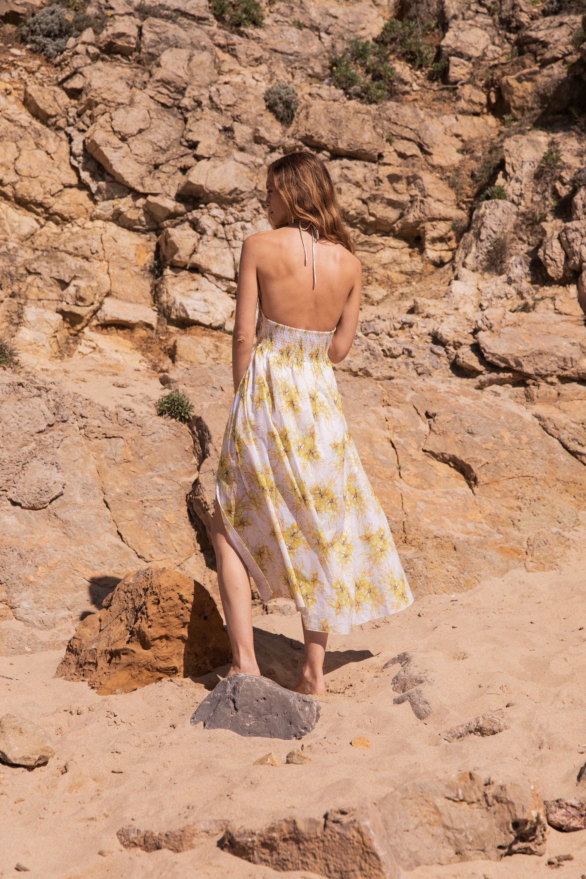 The perfect resort dress. A flattering comfortable silhuette with a haterneck neckline, and elastic at the back for easy fitting. Crafted in cotton voile and printed in our exclusive Yellow bloom