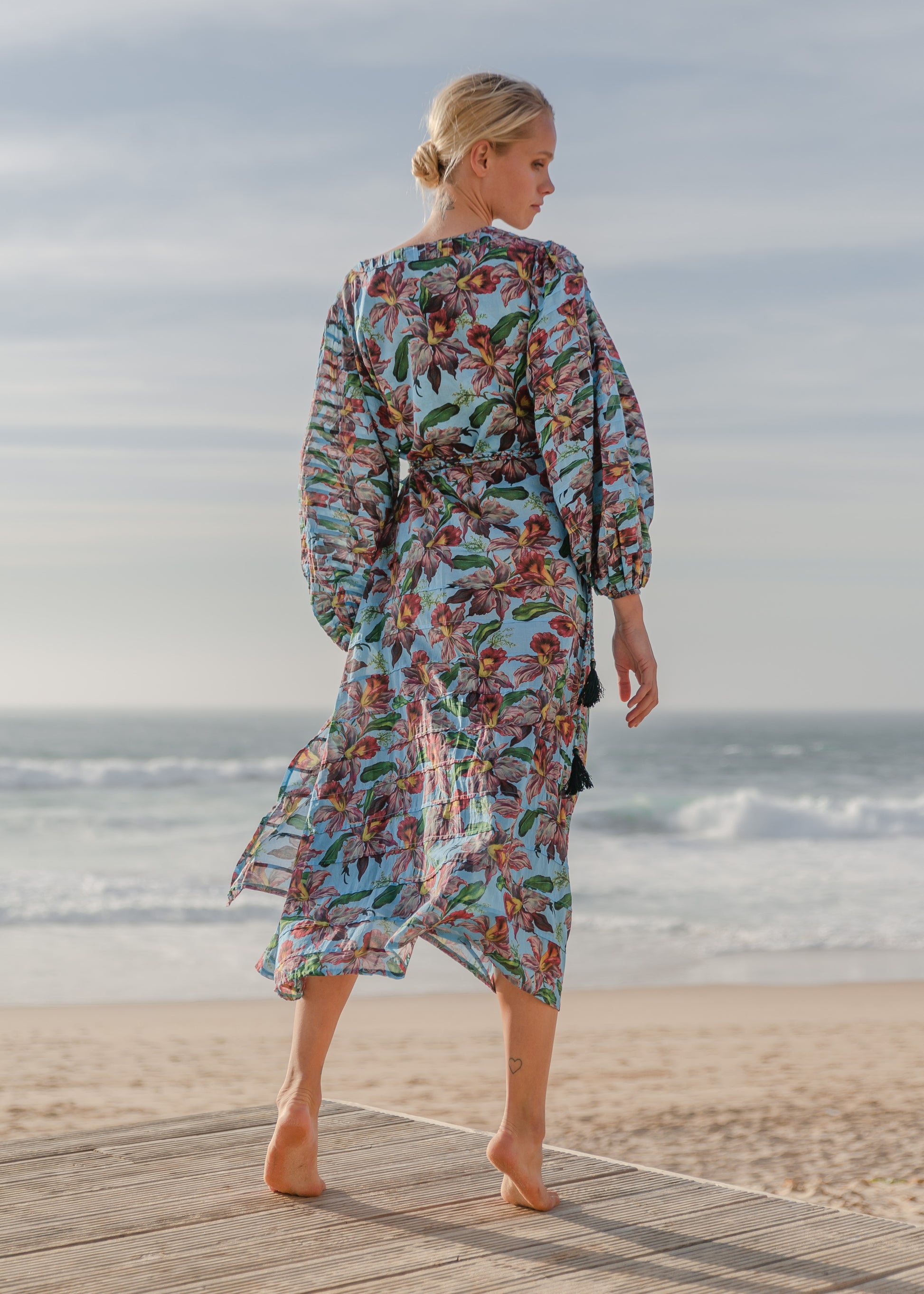 This beauty had been crafted in beautiful soft cotton voile featuring our new print “Radiant flower”. Handcraft work in the sleeves and the skirt gives this resort piece an elevated look.
