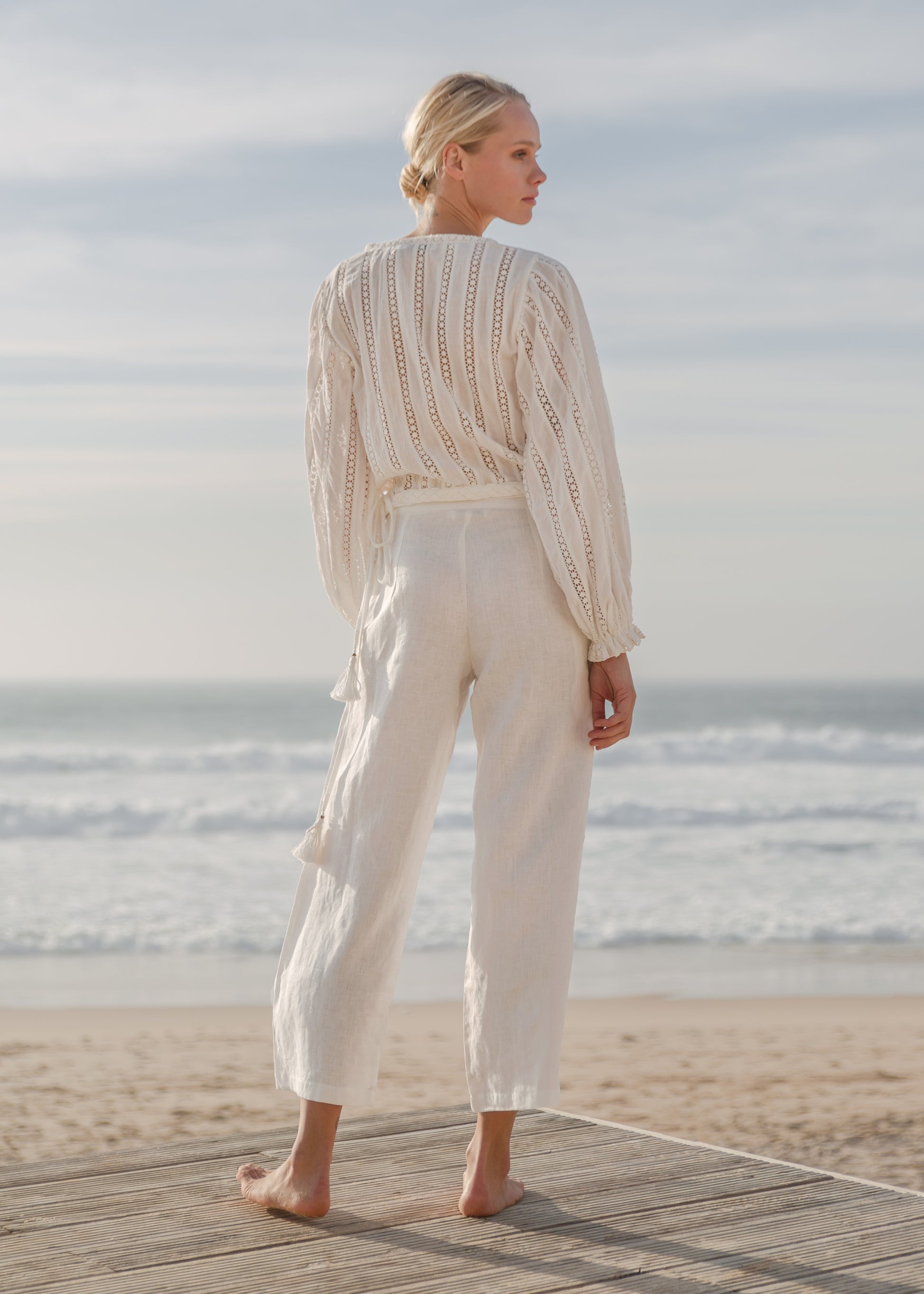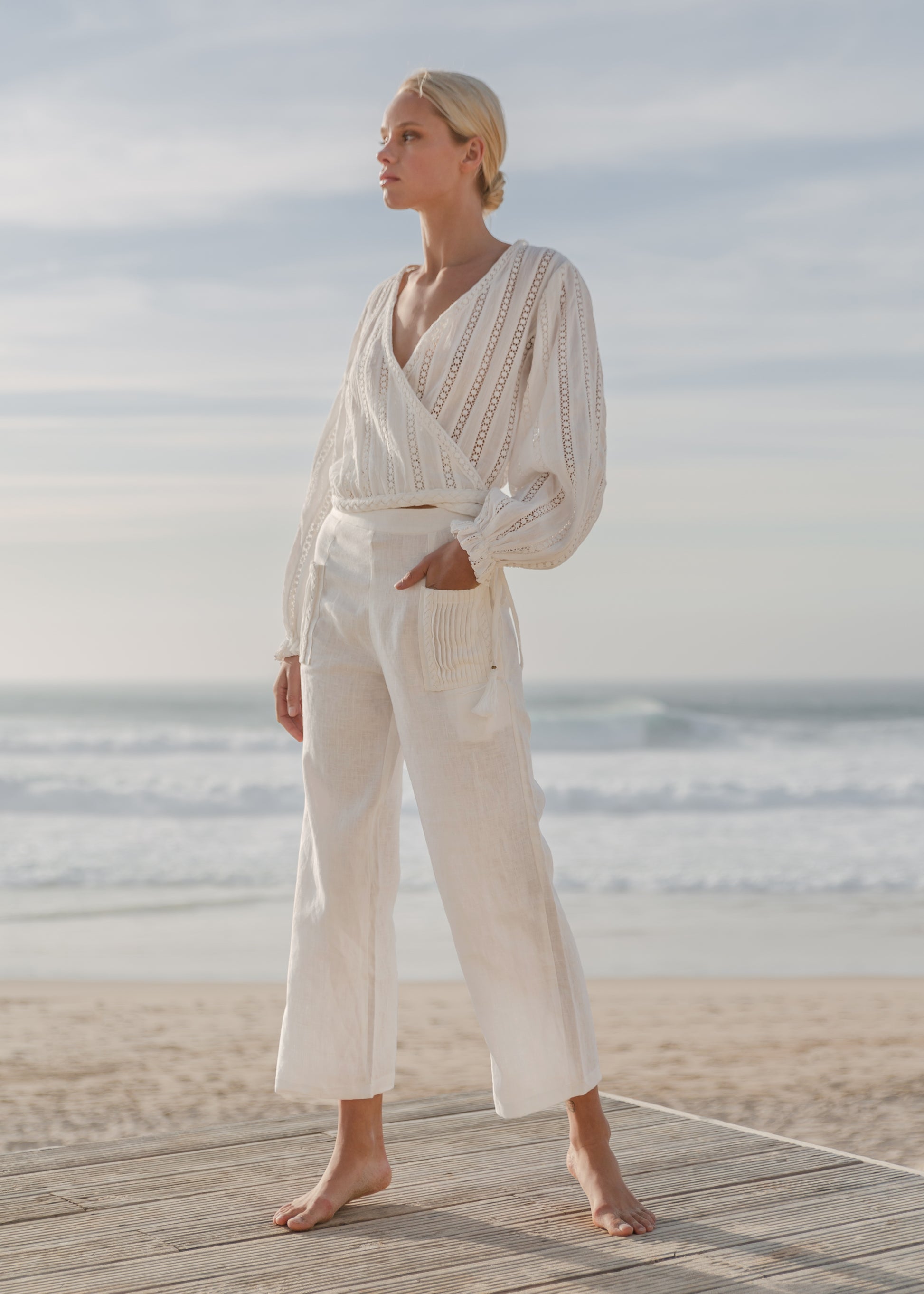 | The perfect wrap shirt. Crafted in cotton sub and using 32 meters of cotton trim, this classy chic beauty can be worn on bare skin or on top of a Summer dress. We recommend to pair this look with Look 32 (shorts linen off white) or Look 35 (long linen off white pants) |