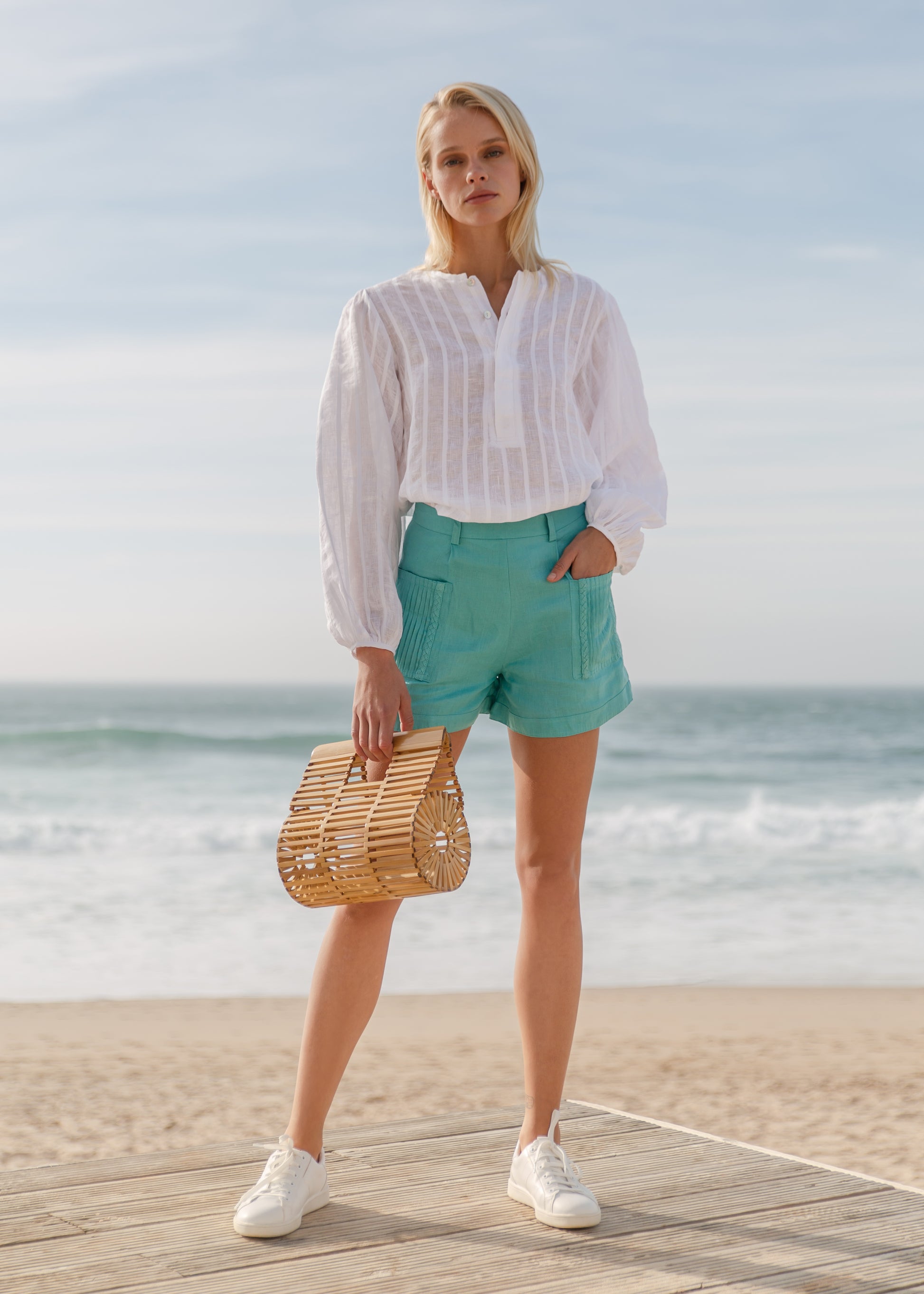 | A relax camisole made in 100 % linen with stripes details. The baloon sleeves gives playfulness to this classy piece. |