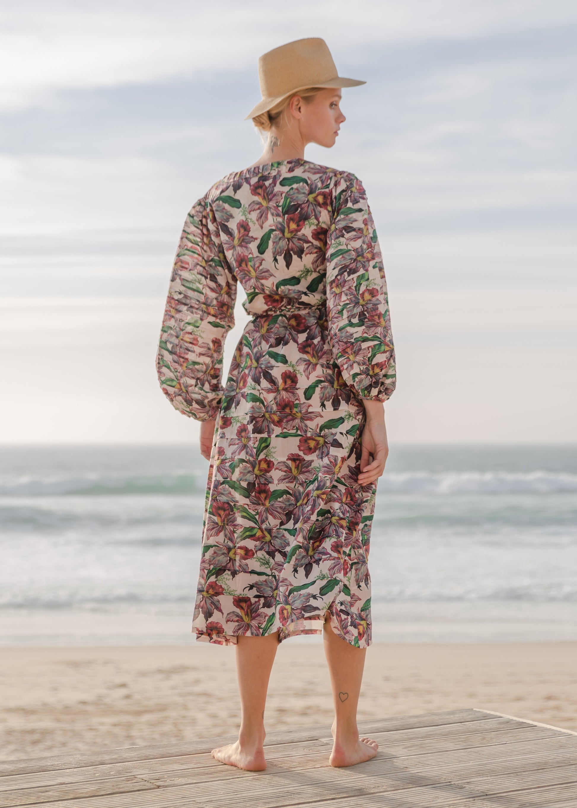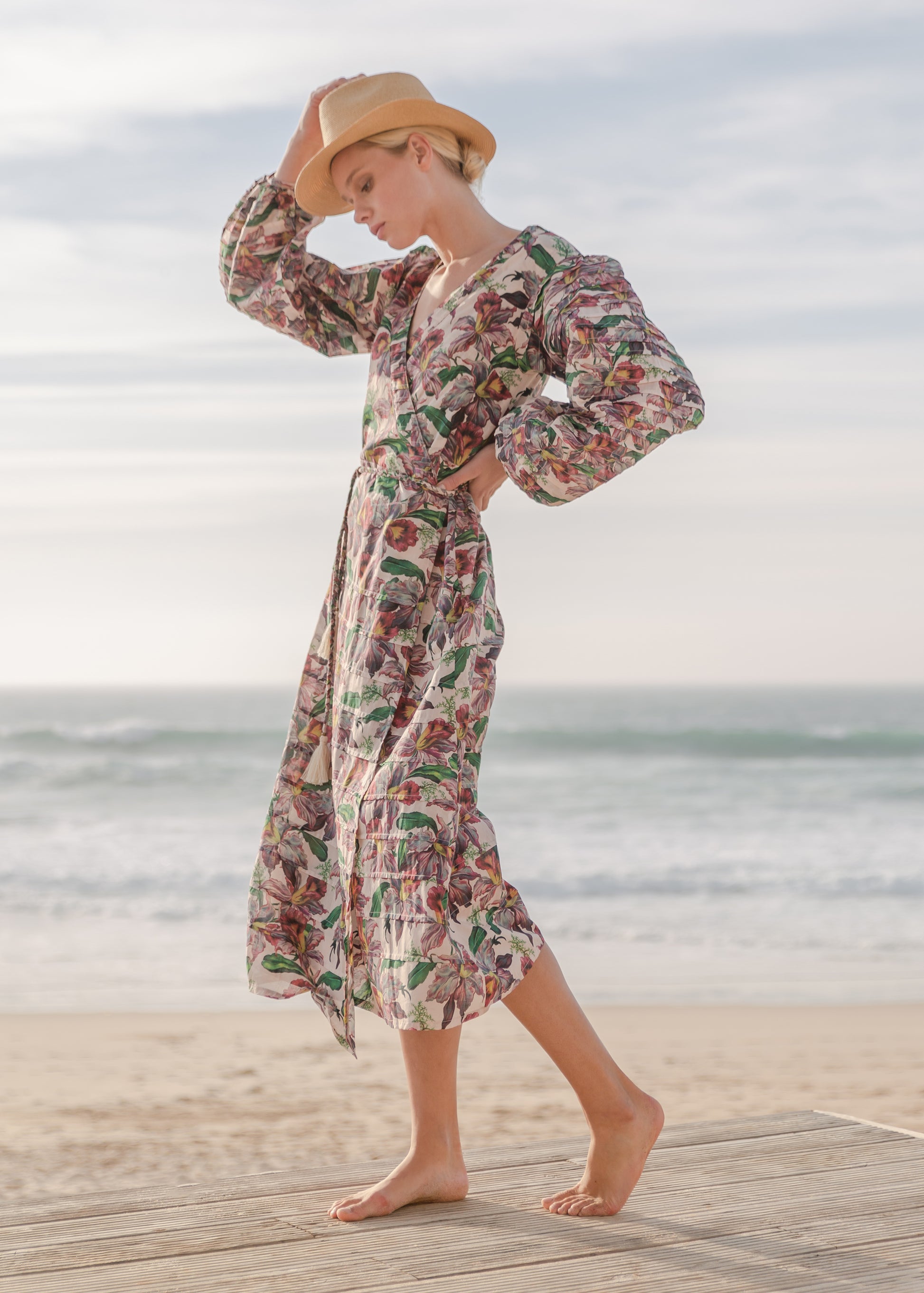 | This beauty had been crafted in beautiful soft cotton voile featuring our new print “Radiant flower”. Handcraft work in the sleeves and the skirt gives this resort piece an elevated look. |
