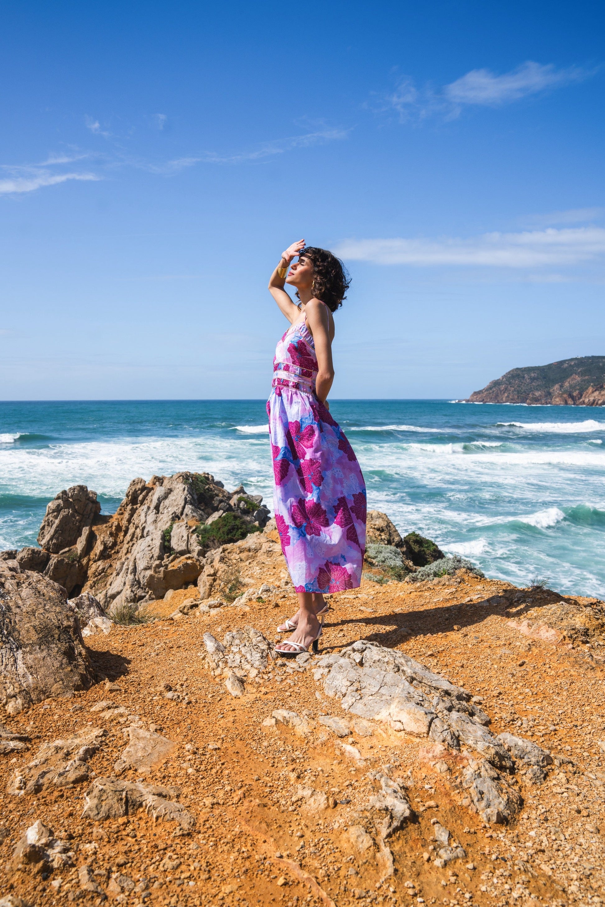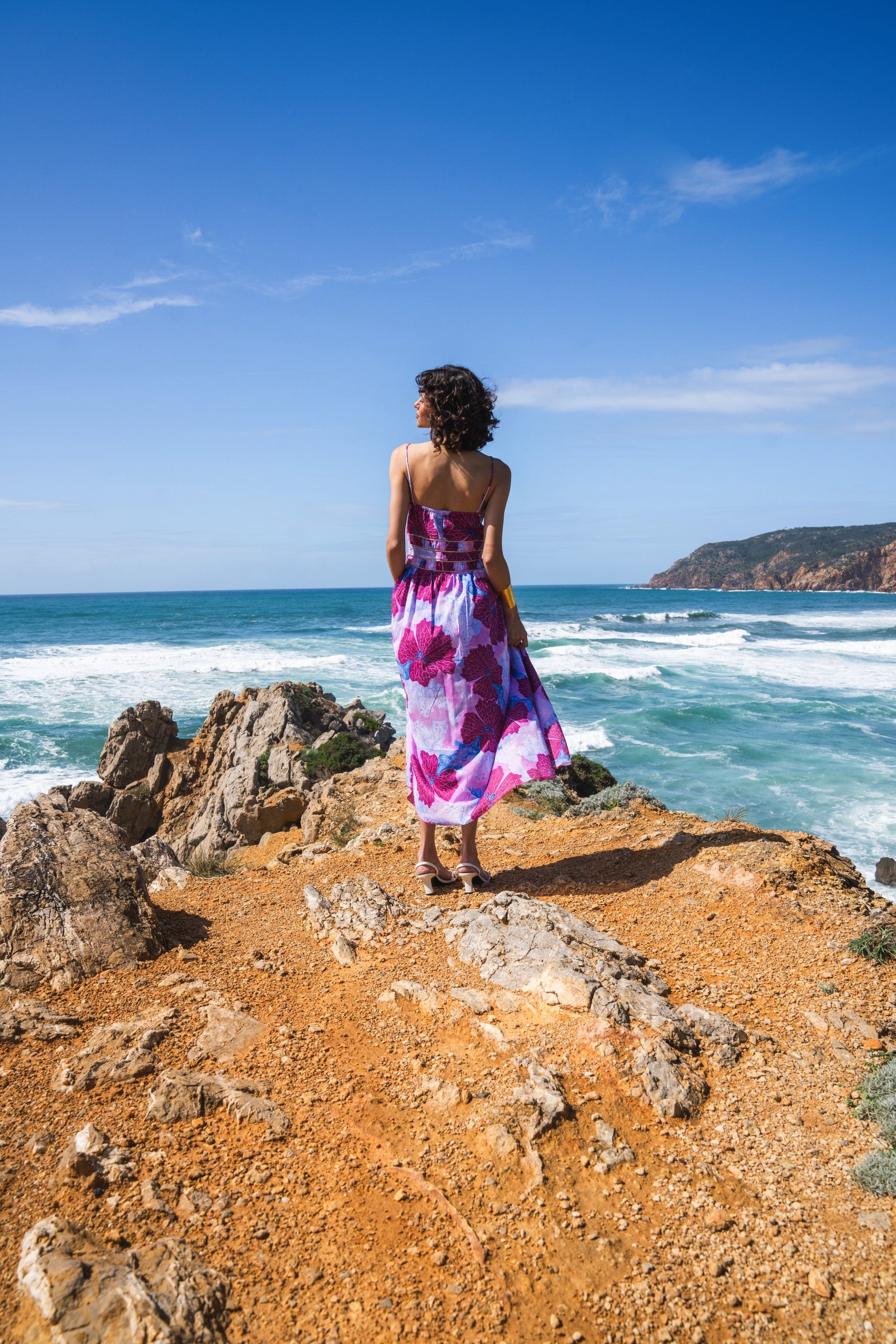 A perfect Summer dress. Crafted in 100% cotton voile and featuring our exclusive "Water Flora" water color print. This spaghetti strap ruched middi dress comes with a lovely gold trim that accentuate the waist and the neckline. A very versatile piece in your wardrobe to wear in the city, garden party or for Summer sunsets. Model is wearing M size and she is 1,70m height tall.