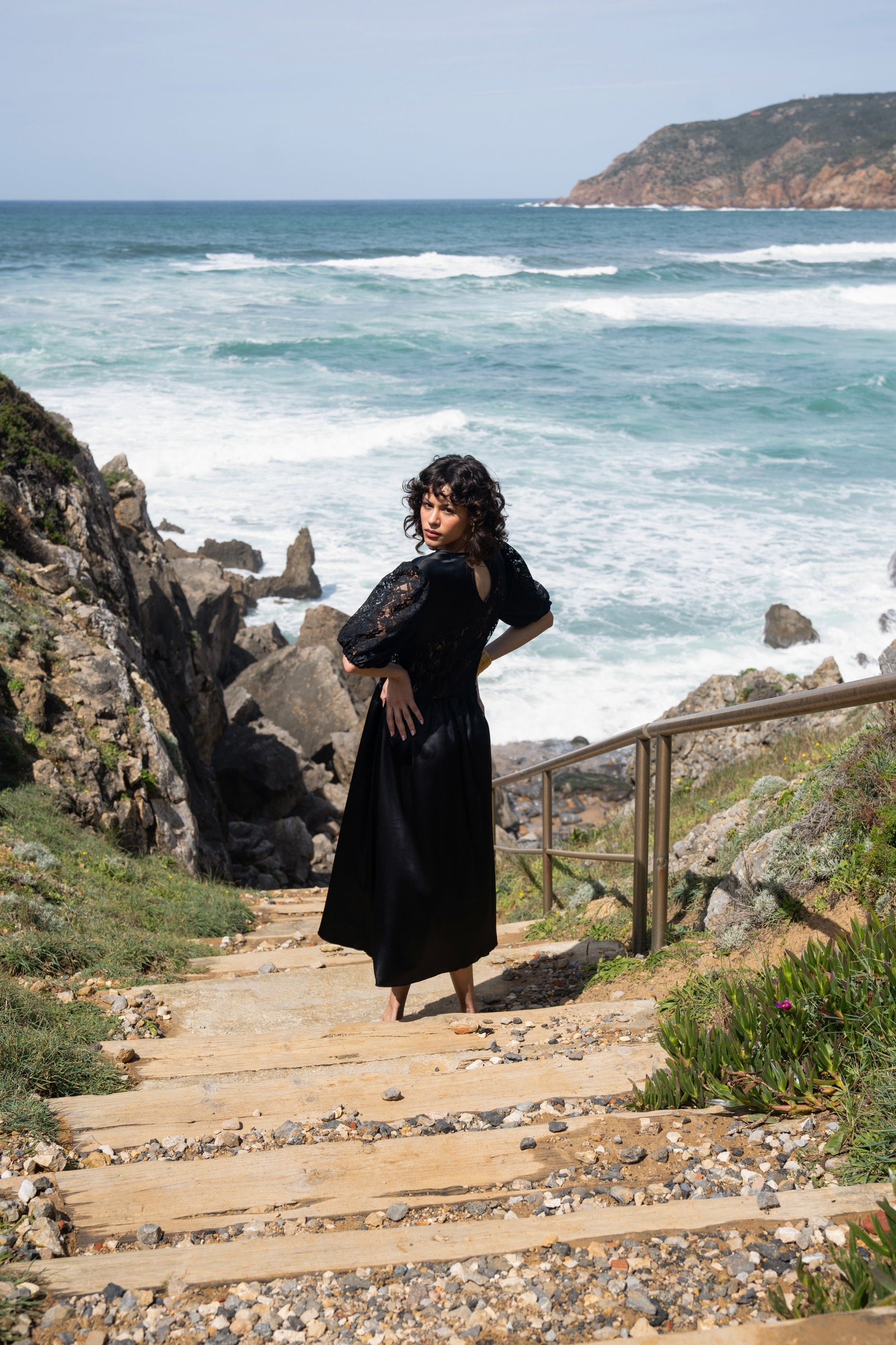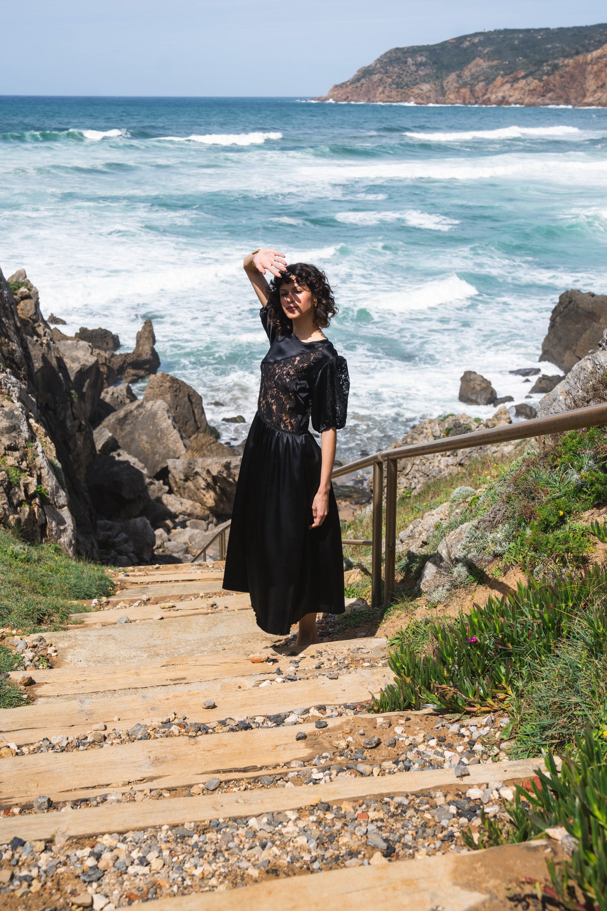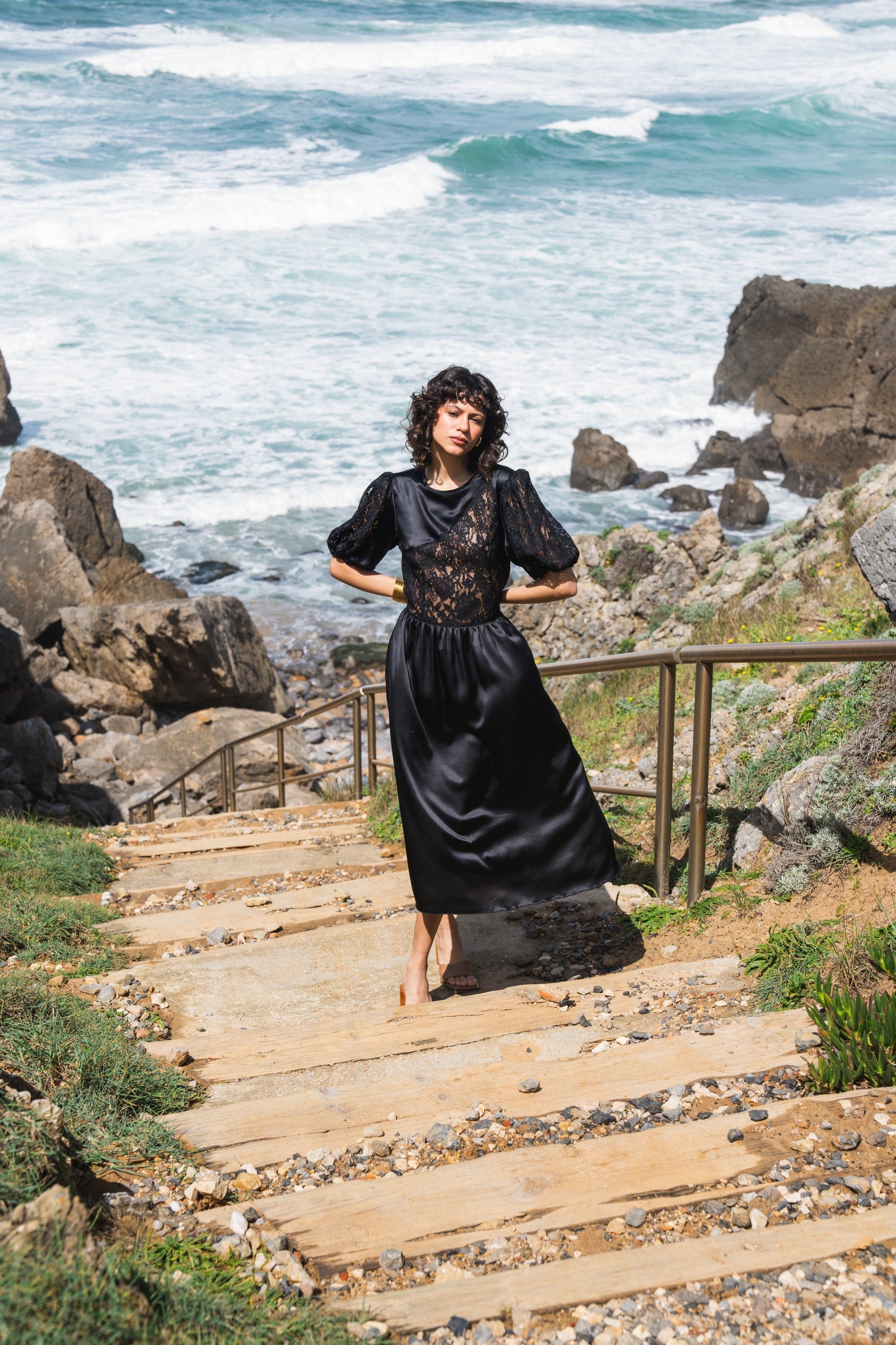 An elegant take on this 100% silk dress. Lace details at the sleeves and at the front and back of the dress. Perfect piece for elegant evenings.
