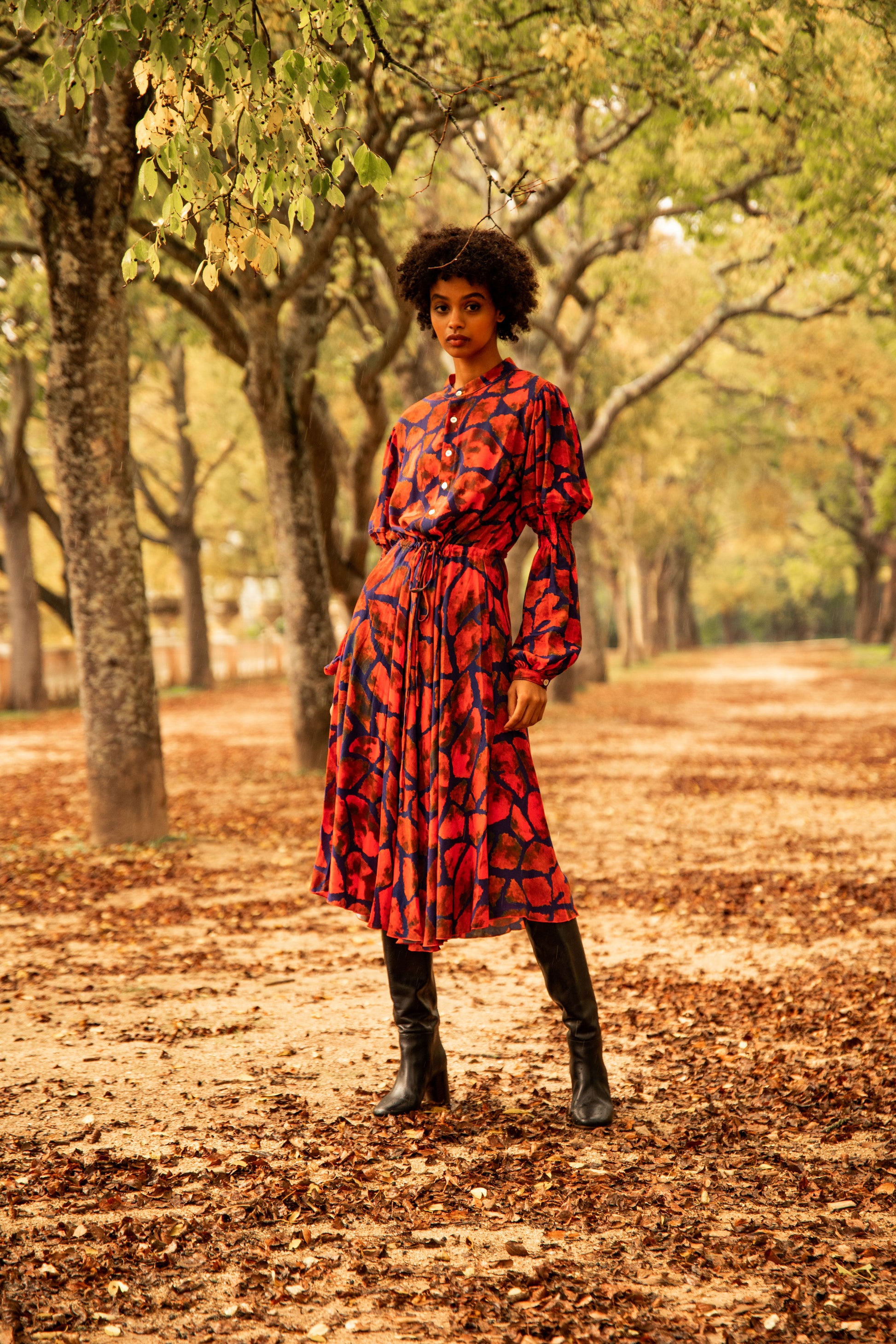 A Dress to wear in all occasions. The beautiful sleeves add playfulness meanwhile the easy draw-strained waist make a perfect dress for both casual and elegant occasions. Made in viscose fujette.