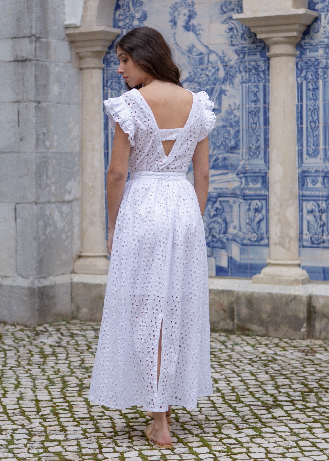 Summer cant be Summer without staple Broderie anglaise dress. Crafted in beautifil broderie anglaise, with ruffles details in the shoulder, pockets on the side of skirt and matching belt this dresss will be your perfect match for Lunch with friends, easy al fresco dinners and for strolling the city.