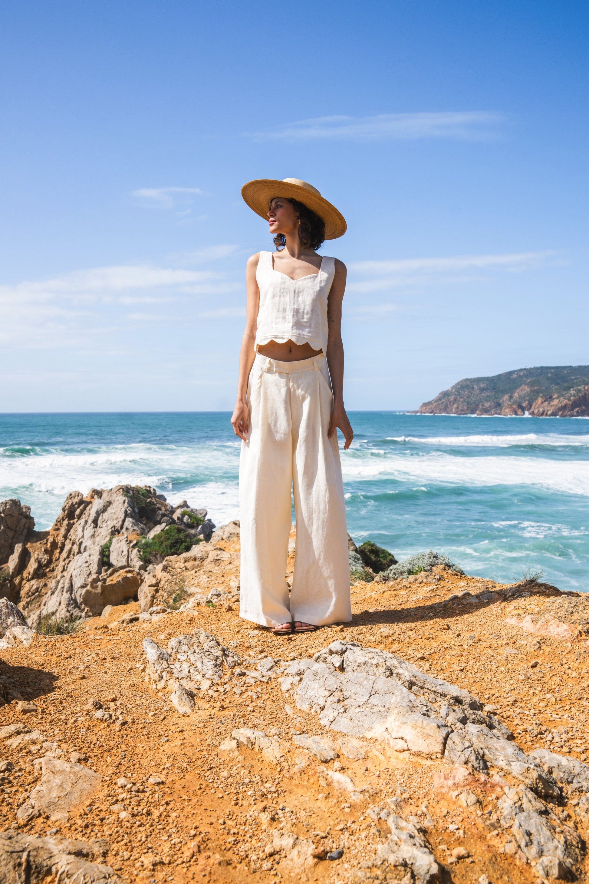 A perfect linen top to match with any of our linen pants, Lily shorts or your denim shorts. A flattering shape at the bust, scallops details in hem and buttons at the back make this piece a versatile piece to wear casual or for the office. Check with us for other color availability.
