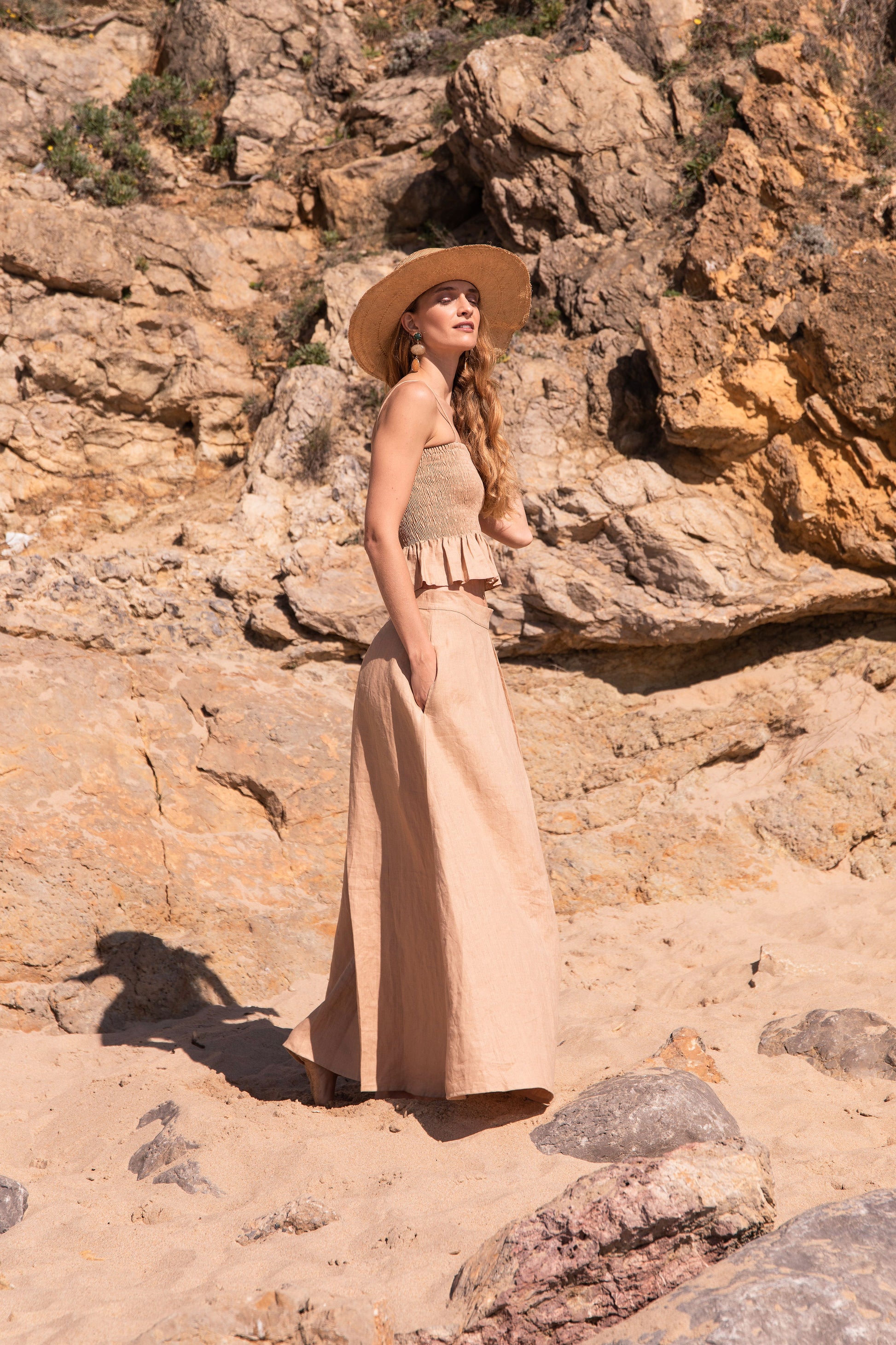 The skirt version of our best seller Sakura pants. A minimal skirt with a dramatic inverted pleat at the front and at the back. For a total tonal look wear yours with the matching Cleo top. Crafted in 100% linen.